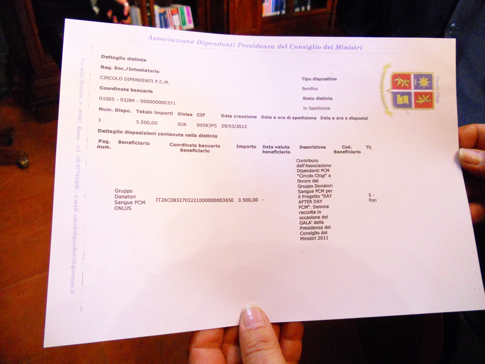 Si è svolta nella sala della Biblioteca Chigiana la consegna dell’attestato di donazione da parte del Presidente del “Circolo Chigi” Giorgio Pizzi al Presidente dell’Associazione donatori di sangue della PCM onlus Roberto Ciofi.