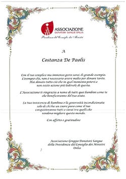 Per questo gesto di solidarietà l’Associazione ha donato alla piccola Costanza una pergamena di ringraziamento.