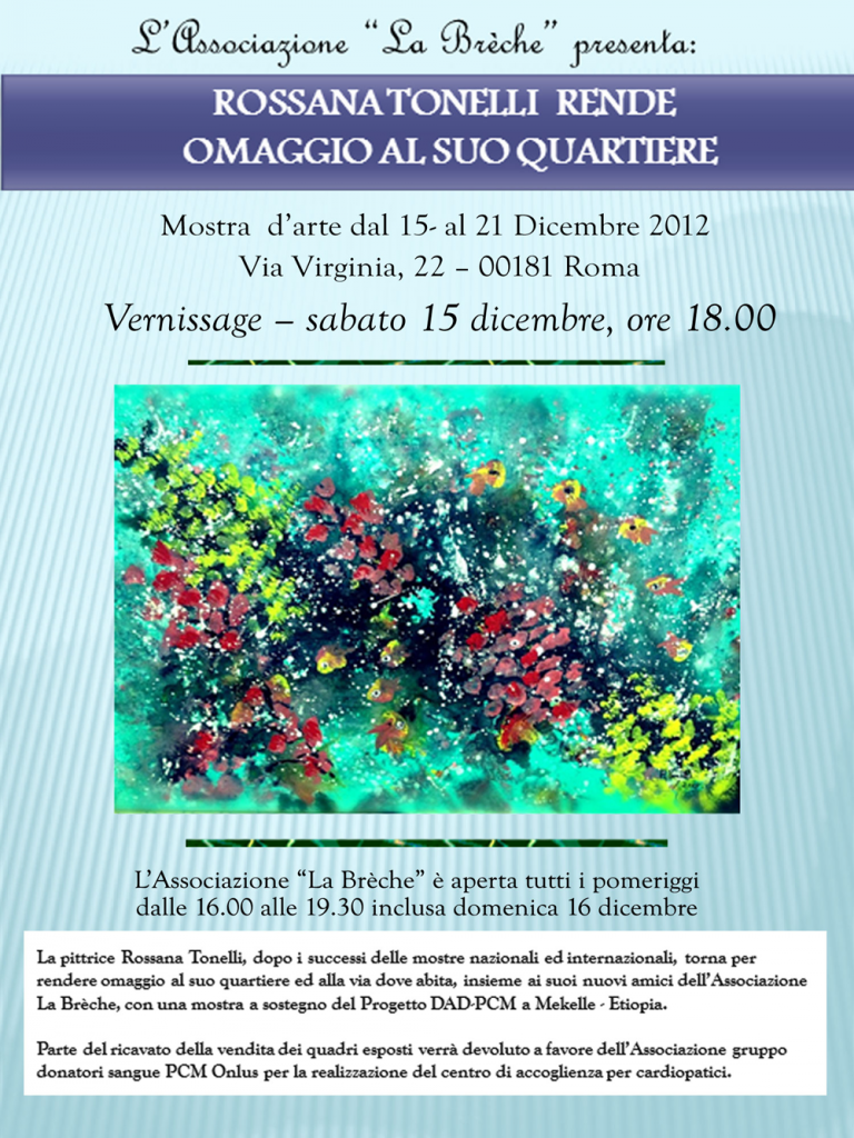 Da oggi sabato 15 fino a venerdì 21 dicembre è presente con una personale dei suoi quadri presso la sede dell’Associazione Brèche in Via Virginia 22 a Roma.