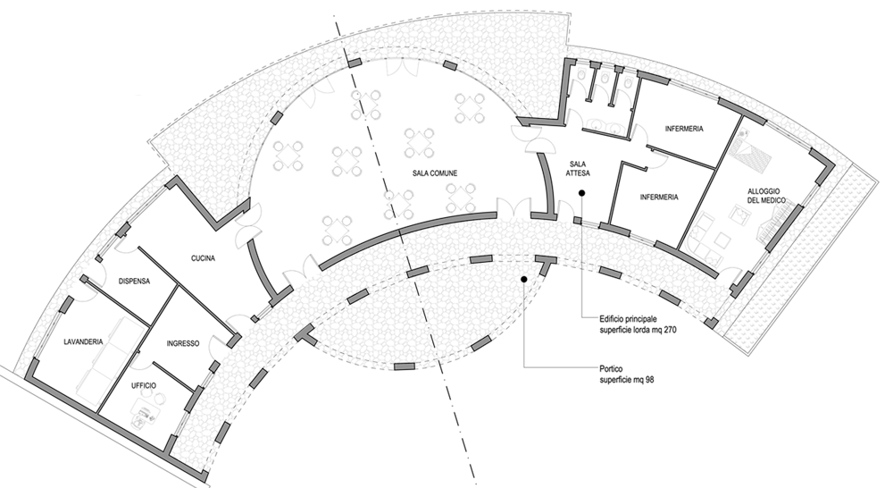 - un edificio principale, per un totale di 270 mq, composto da una grande sala comune, un’ala dedicata ai servizi (cucina, dispensa e lavanderia) ed un’ala destinata ad alloggio personale medico e zona infermeria