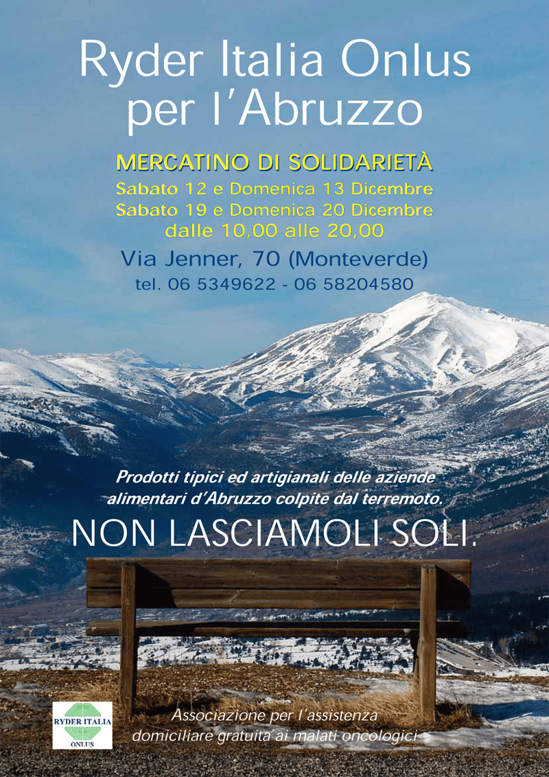 L’associazione Ryder Italia onlus organizza un mercatino di solidarietà con vendita di prodotti tipici e artigianali delle aziende alimentari d’Abruzzo per offrire un contributo alle popolazioni colpite dal terremoto.