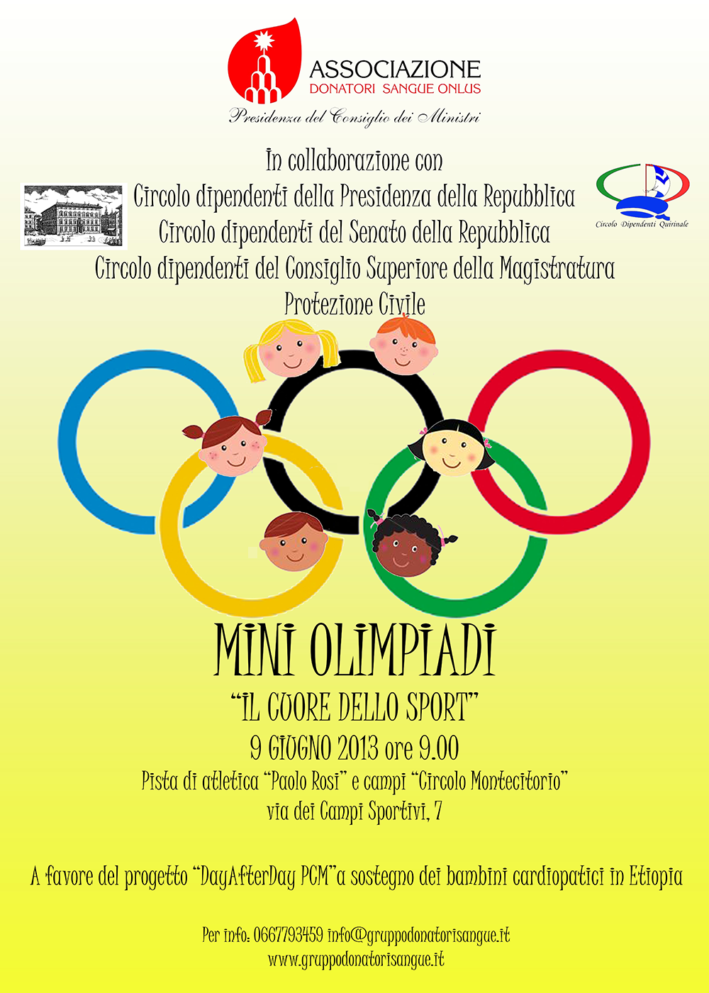 Domenica 9 giugno 2013 l’Associazione Donatori Sangue della Presidenza del Consiglio dei Ministri in collaborazione con il Circolo dei dipendenti della Presidenza della Repubblica, il Circolo dipendenti del Senato della Repubblica, il Circolo dipendenti del Consiglio Superiore della Magistratura e la Protezione Civile organizzano le MINI-OLIMPIADI “il Cuore dello sport”, una giornata all’insegna dello sport, del divertimento e della solidarietà.