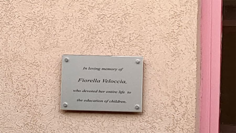 La targa è dedicata al ricordo della mamma, Fiorella Veloccia, scomparsa all’età di 65 anni, quando ancora esercitava la professione di insegnante, così da simboleggiare un collegamento ideale tra i suoi scolari dell’I. C. “Frosinone 3” e i bambini ospitati nel Centro che in questo luogo hanno la possibilità di condividere momenti di studio e di gioco.