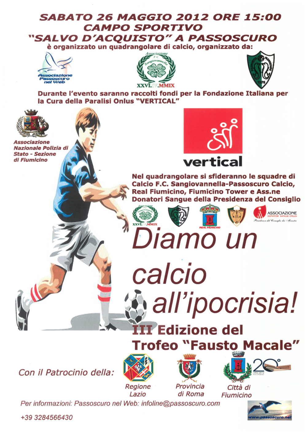 Si terrà sabato 26 maggio alle ore 15,00 la terza edizione del trofeo “Fausto Macale”, quadrangolare di calcio  presso il campo sportivo “Salvo d’Acquisto” a Passoscuro.