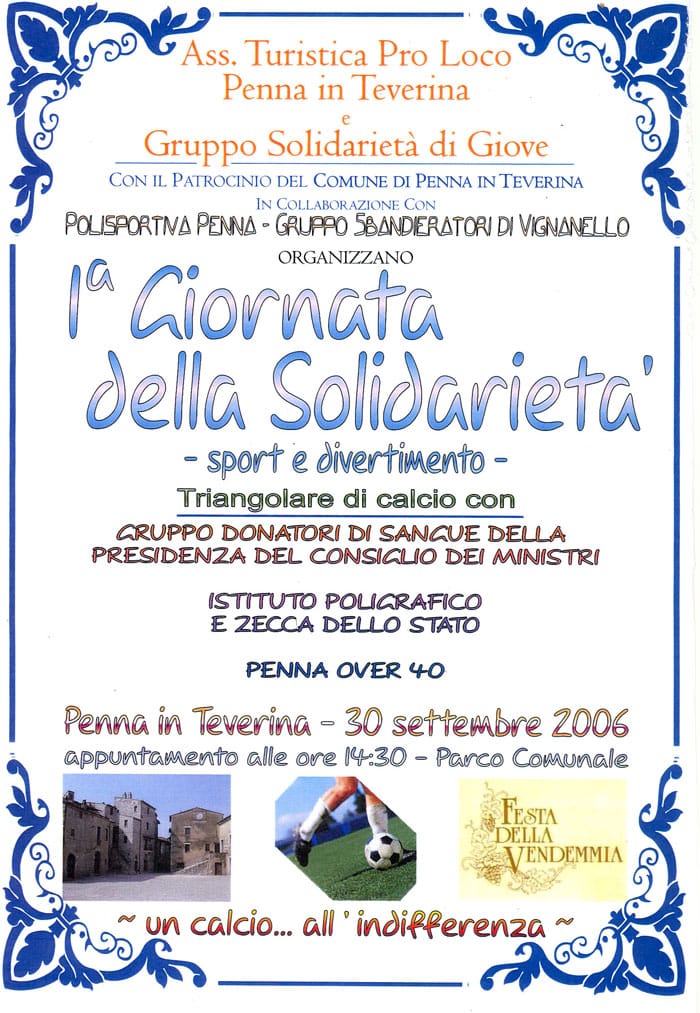Con “un calcio all’indifferenza” l’Ass. turistica Pro loco Penna in Teverina e il gruppo di Solidarietà di Giove, con il Patrocinio del Comune e la collaborazione della Polisportiva Penna, hanno organizzato un triangolare di calcio per la raccolta fondi destinata a famiglie in condizioni socialmente disagiate.
